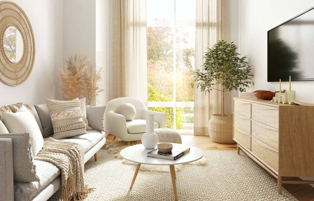 Les meubles aux teintes claires préservent la luminosité. Bois clair (chêne blanchi, hêtre, bouleau), mélaminé blanc ou beige, rotin naturel : ces matériaux réfléchissent au lieu d’absorber. Un canapé beige réfléchit 60% de lumière contre 15% pour un canapé marron foncé.